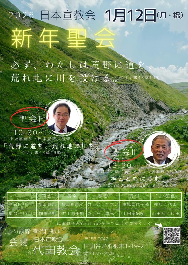 31 Dec 2026 日本宣教会 Posted at 00:00h in Uncategorized by Steven 0 Comments 0 Likes 日時 2026年1月12日標語 必ず、 わたしは荒野に道を荒れ地に川を設ける(イザヤ43:19) 聖会I 10:30 講師 小坂嘉嗣 聖会Ⅱ 13:30 講師 重城博之 会場 : 日本宣教会代田教会 YouTubeライブ配信はQRコードからご視聴いただけます。他教団の方でも、どなたも歓迎したいます。